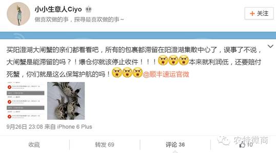 1、顺丰马上就“耍流氓”,不保证时效,不保证大闸蟹的死活。看看下图的投诉就知道: